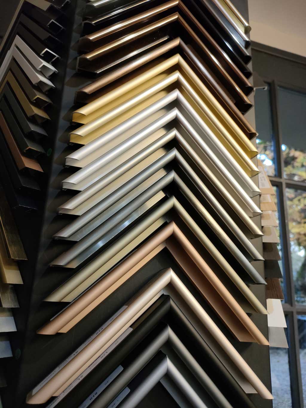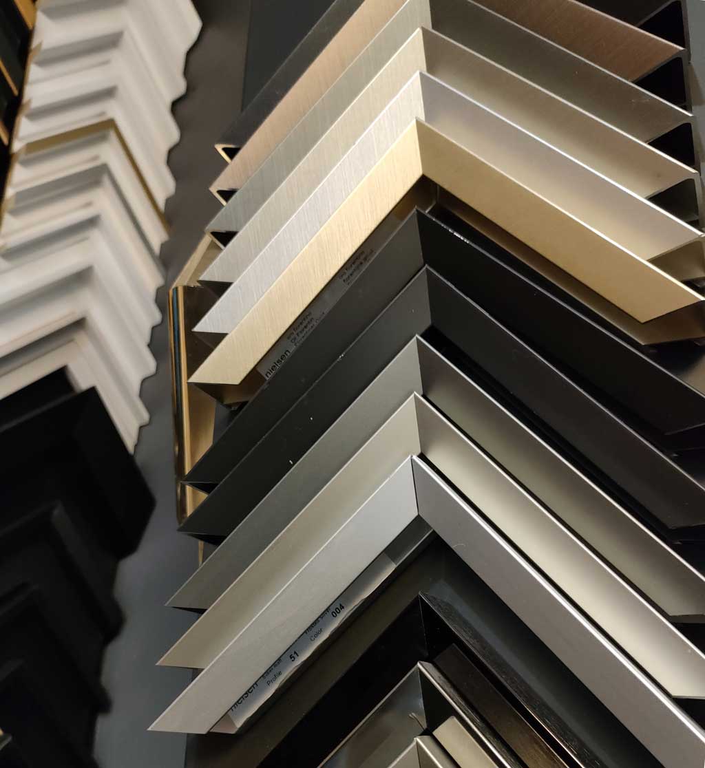 En fonction de vos goûts et de la nature de l’œuvre, je vous propose une sélection de matériaux et de techniques adaptés. Chaque encadrement est choisi avec vous que ce soient les moulures, le ou les passe-partout avec ou sans biseau, le type de verre (classique, anti-reflet, anti UV, plexi) et le système d’accroche.